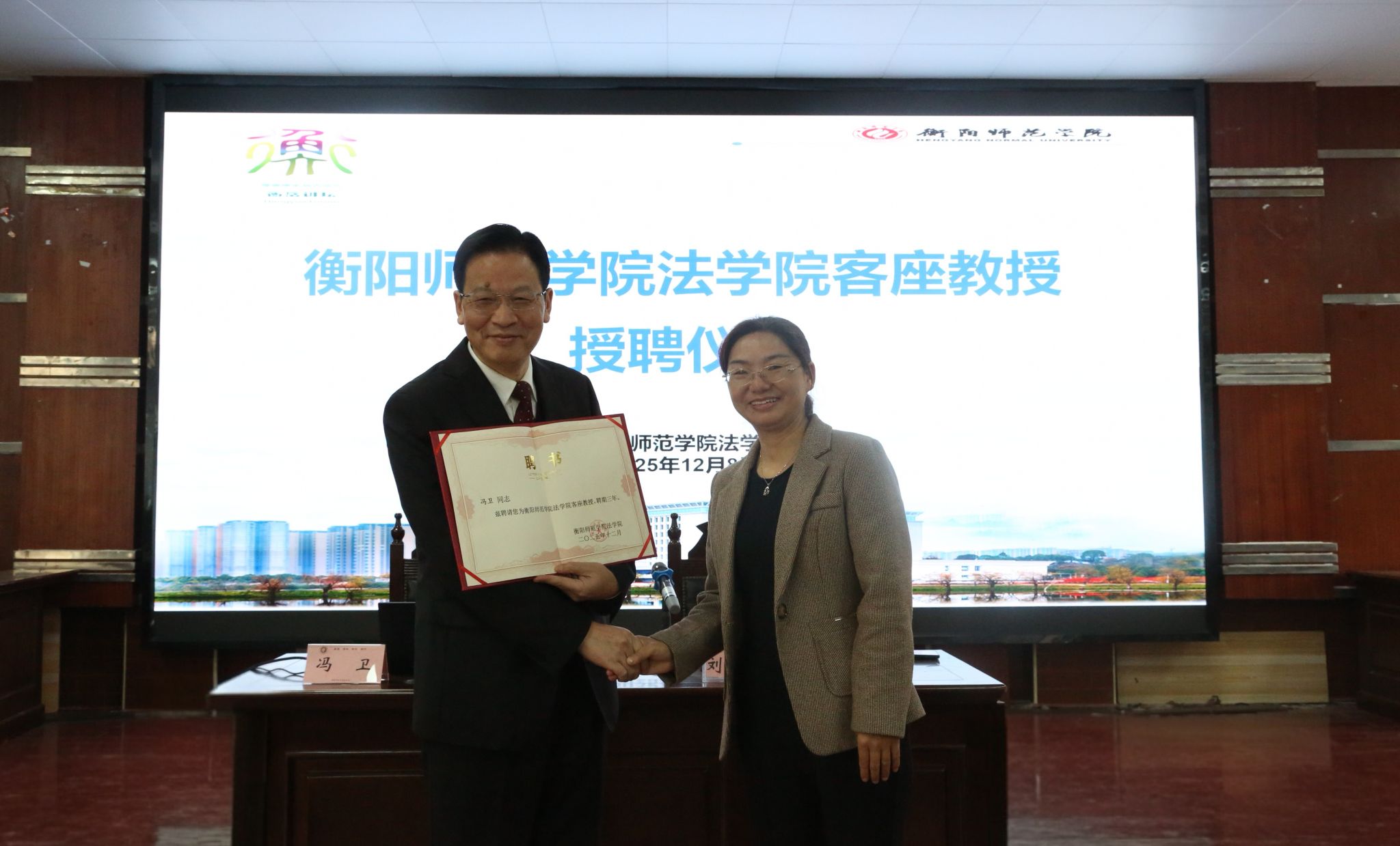 在聘任仪式上,刘余香介绍了冯卫副院长的职业经历和相关成就,并代表学院向其颁发客座教授聘书。她表示,冯卫副院长长期从事司法审判工作,具有深厚的理论素养和丰富的实务经验,他的加入将为法学院的人才培养、学科建设和实践教学注入新的活力。