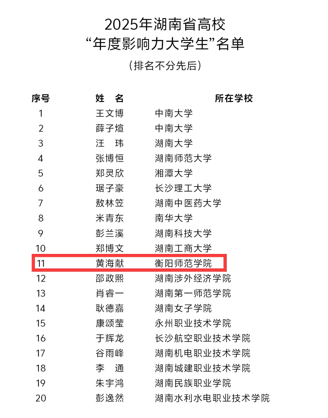 近日,湖南省教育厅公布了2025年“年度影响力人物”推选结果,我院2021级法学专业学生黄海献,凭借其军营生涯铸就的优异成果,以及令人瞩目的自强事迹,光荣当选“年度影响力大学生”。
