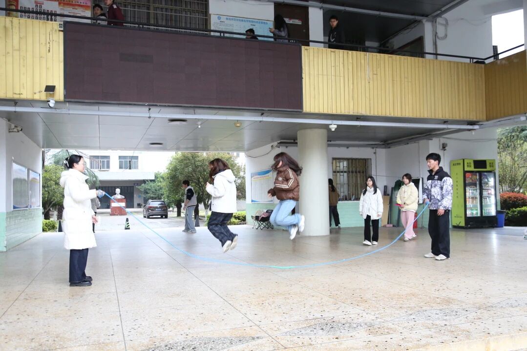 跳大绳:蓝色长绳在同学手中翻飞,大家依次跃入绳间,轻盈跳跃、默契配合,绳影间满是青春跃动的节奏;