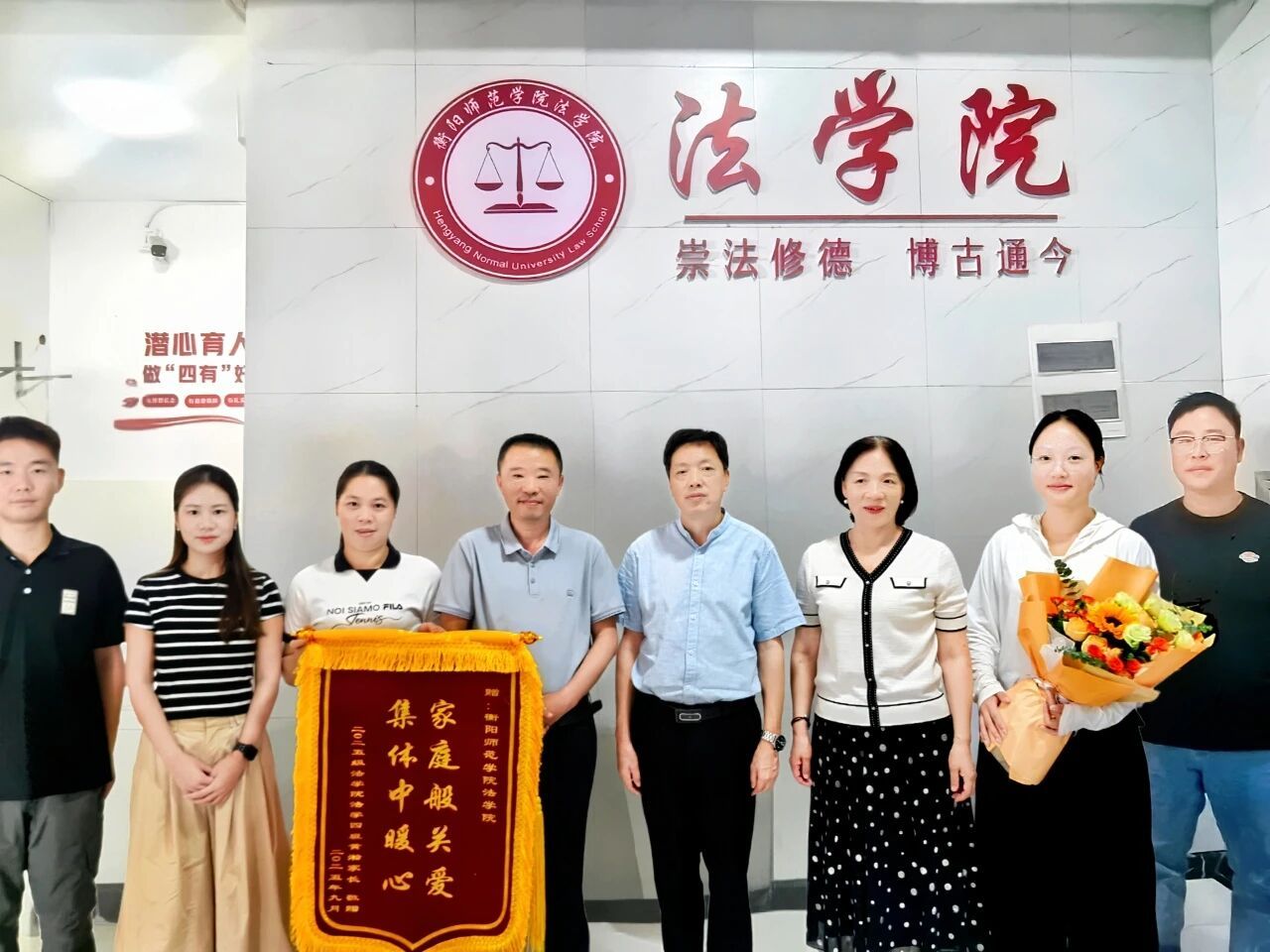 10月11日,2025级法学4班学生家长满怀感激之情来到我校东校区仁智楼B栋法学院办公室,将一面印有“家庭般关爱,集体中暖心。”的锦旗赠予我院。我院党总支书记杨家骏、党总支副书记罗耒英、学工办副主任兼团委书记黎兆萍、辅导员蒋秋琼、黄梓芸、任英杰、刘徽作为学院代表,共同接过了这面意义深远的锦旗。