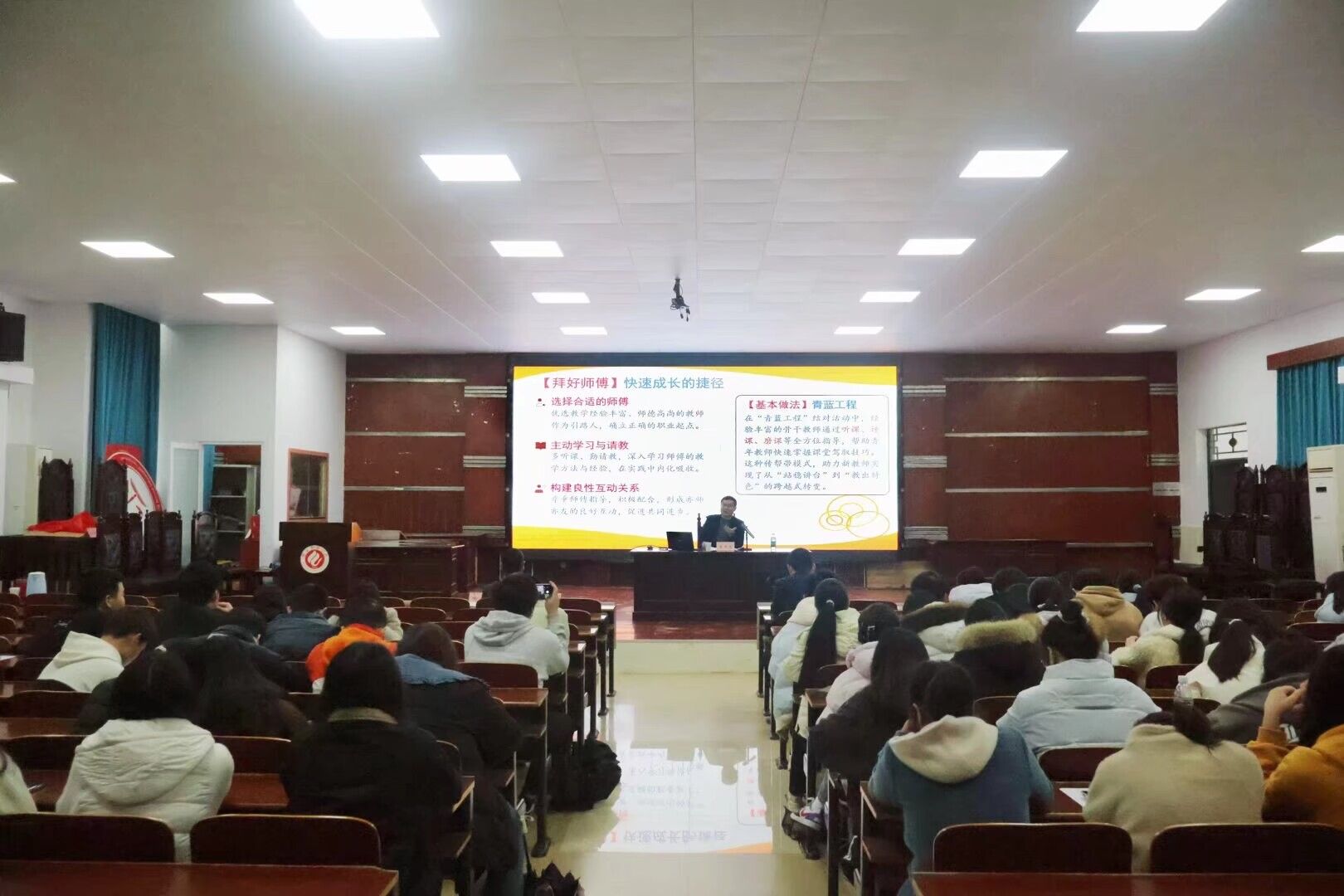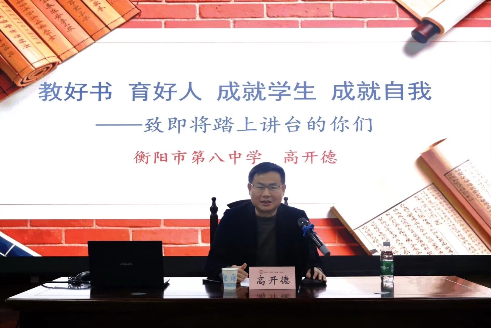首先,高开德以德国哲学家雅斯贝尔斯的名言“教育是一棵树摇动另一棵树,一朵云推动另一朵云,一个灵魂唤醒另一个灵魂”引入,他指出,从学生到教师不仅是身份的转变,更是责任与使命的传承。他强调,师德师风是教师立身之本,同学们应争做有理想信念、道德情操、扎实学识、仁爱之心的“四有”好老师。随后,他从融入校园文化、深耕教学技能、做好班主任育人工作三个方面,系统讲解历史教师成长路径。他以衡阳市第八中学“从高从严,求真求美”的校园精神为例,阐释校园文化对教师成长与育人工作的重要性。同时他引导大家在听课、备课、上课等教学环节中提升教学能力,用耐心与责任心陪伴学生成长,做好家校协同育人工作。最后,他倡导大家在成就学生中实现自我价值,以赤诚之心践行育人使命,并衷心祝愿各位同学在未来的教师岗位上一帆风顺,桃李满天下。