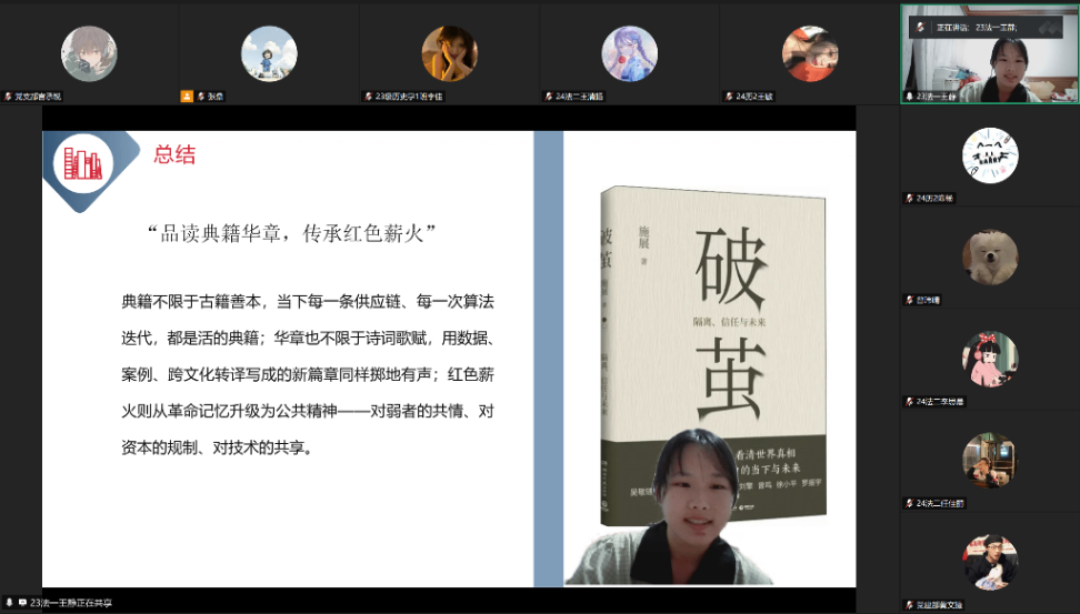 此次线上读书分享会加强了红色文化教育,传承弘扬了红色文化,推动我院入党积极分子更好地了解当下社会存在的问题,提供思考未来的框架,激发入党积极分子们的思考,引导他们在困境中寻找破茧而出的力量,更好地肩负起当代青年的责任,为新时代中国的建设贡献力量。我院入党积极分子们也将以此次分享会为契机,在今后的学习和生活中继续深入学习红色文化,传承红色薪火!